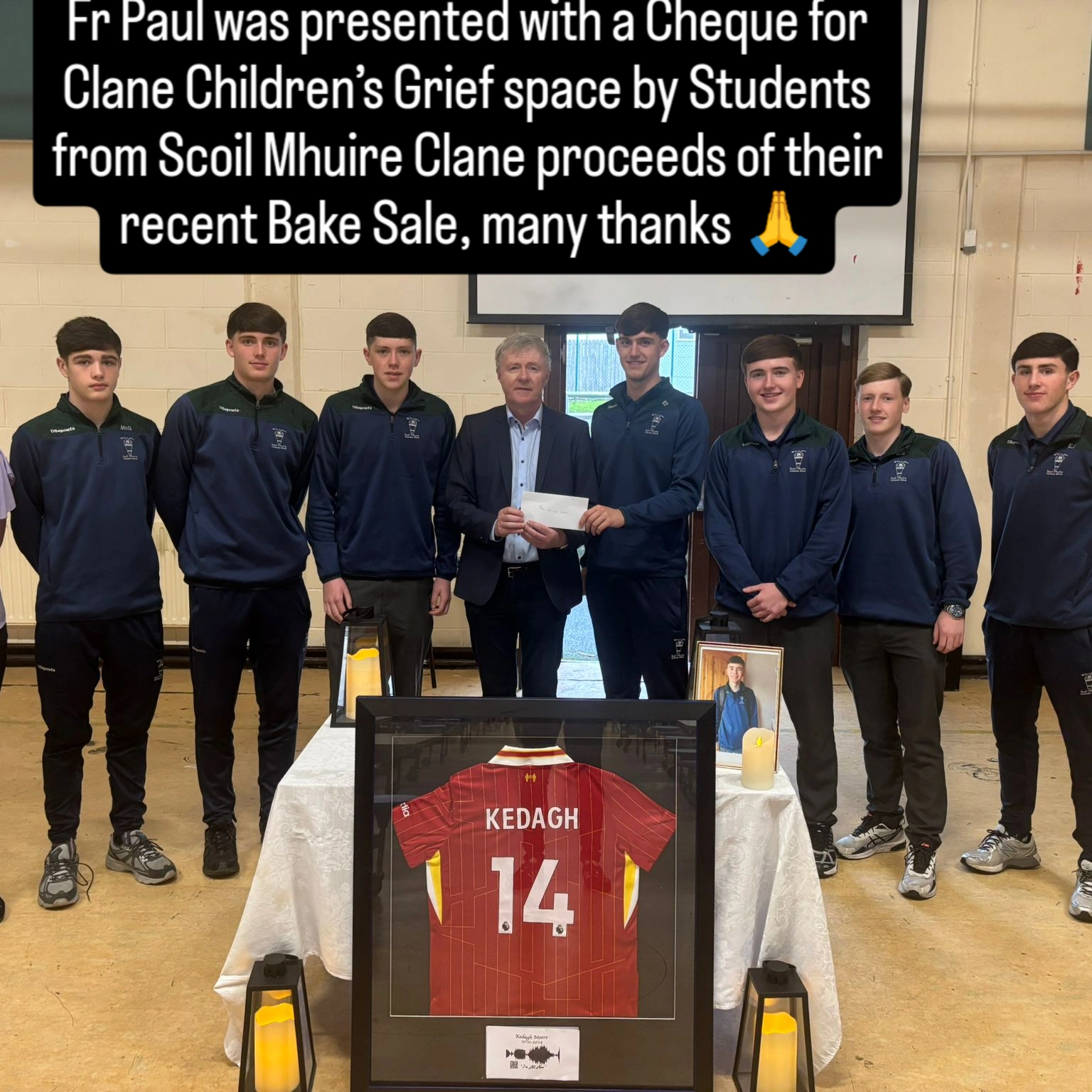 Fr Paul was presented with a Cheque for Clane Children’s Grief space by Students from Scoil Mhuire Clane proceeds of their recent Bake Sale, many thanks 🙏